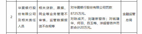 9月5日,国家金融监管总局发布的行政处罚信息显示,华夏银行因相关贷款、票据、同业等业务管理不审慎,监管数据报送不合规等违法违规行为,被处罚金8725万元;相关责任人陈成天、刘建新被“警告”,钱建华、何羽、吕玉梅、涂超被“警告”并罚款合计20万元。